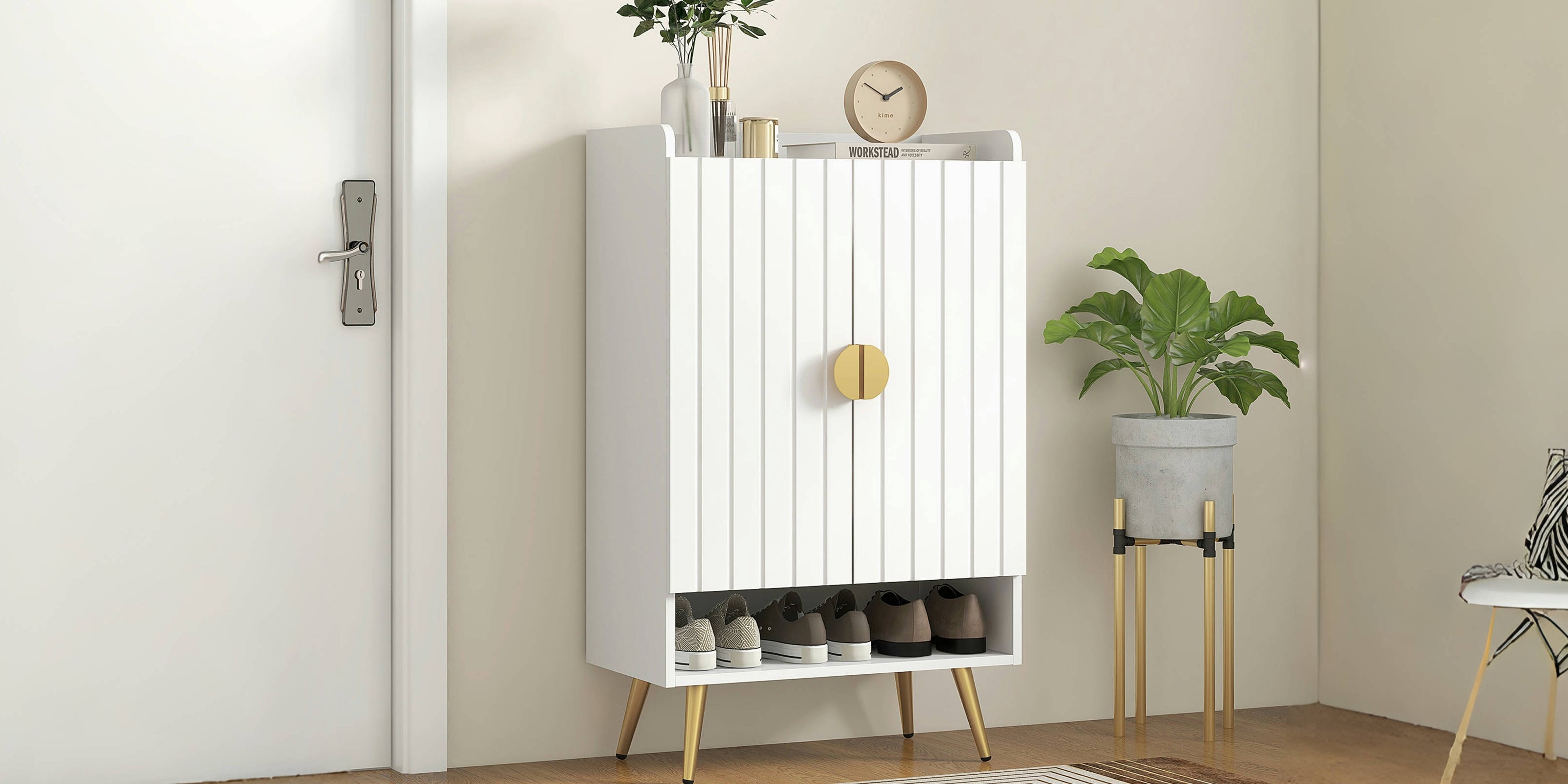 Meuble à chaussures armoire à chaussures 4 abattants 20 paires avec étagère réglable style bohème pieds en bois massif 105 x 24 x 97,5 cm blancMeuble à chaussures armoire à chaussures 4 abattants 20 paires avec étagère réglable style bohème pieds en bois massif 105 x 24 x 97,5 cm blanc