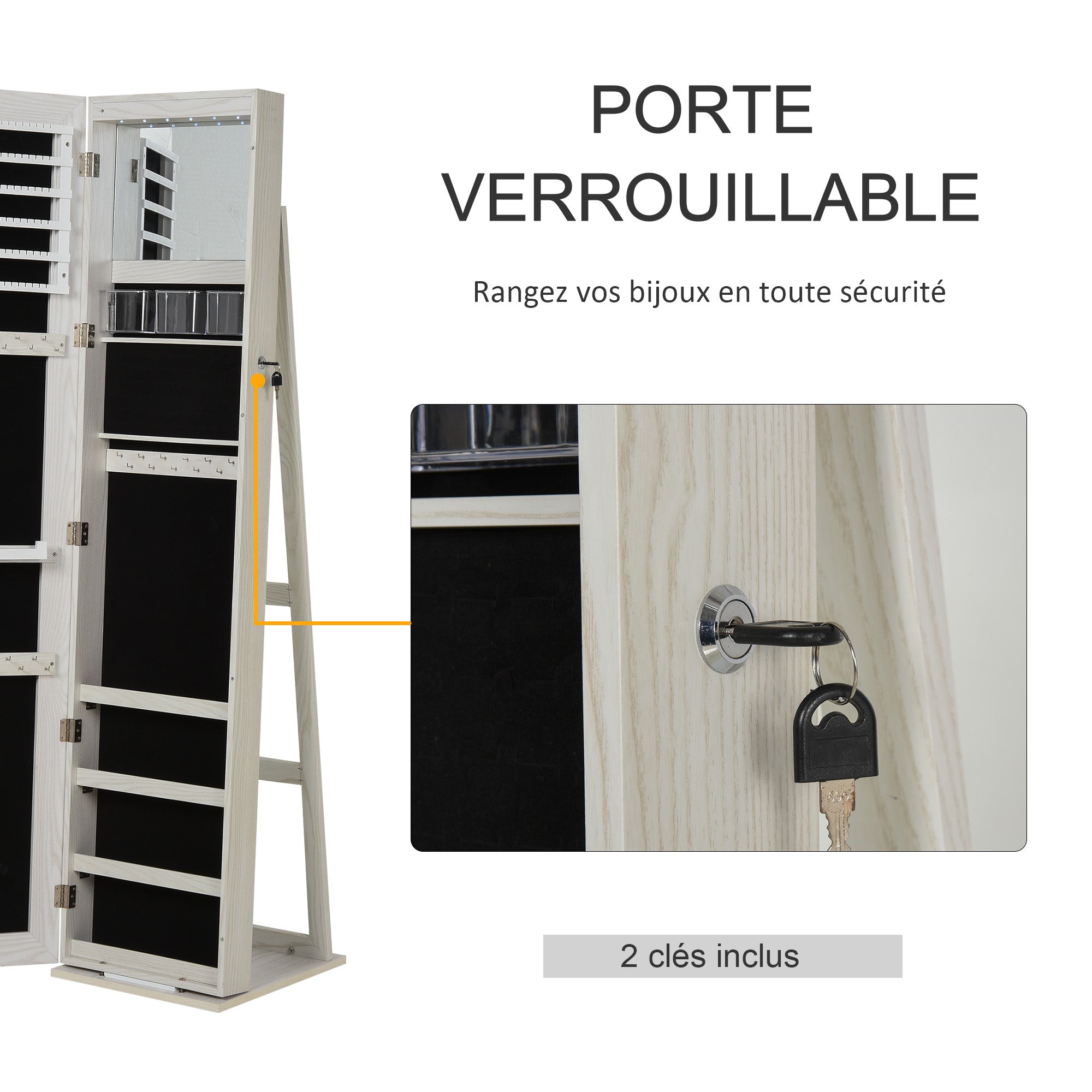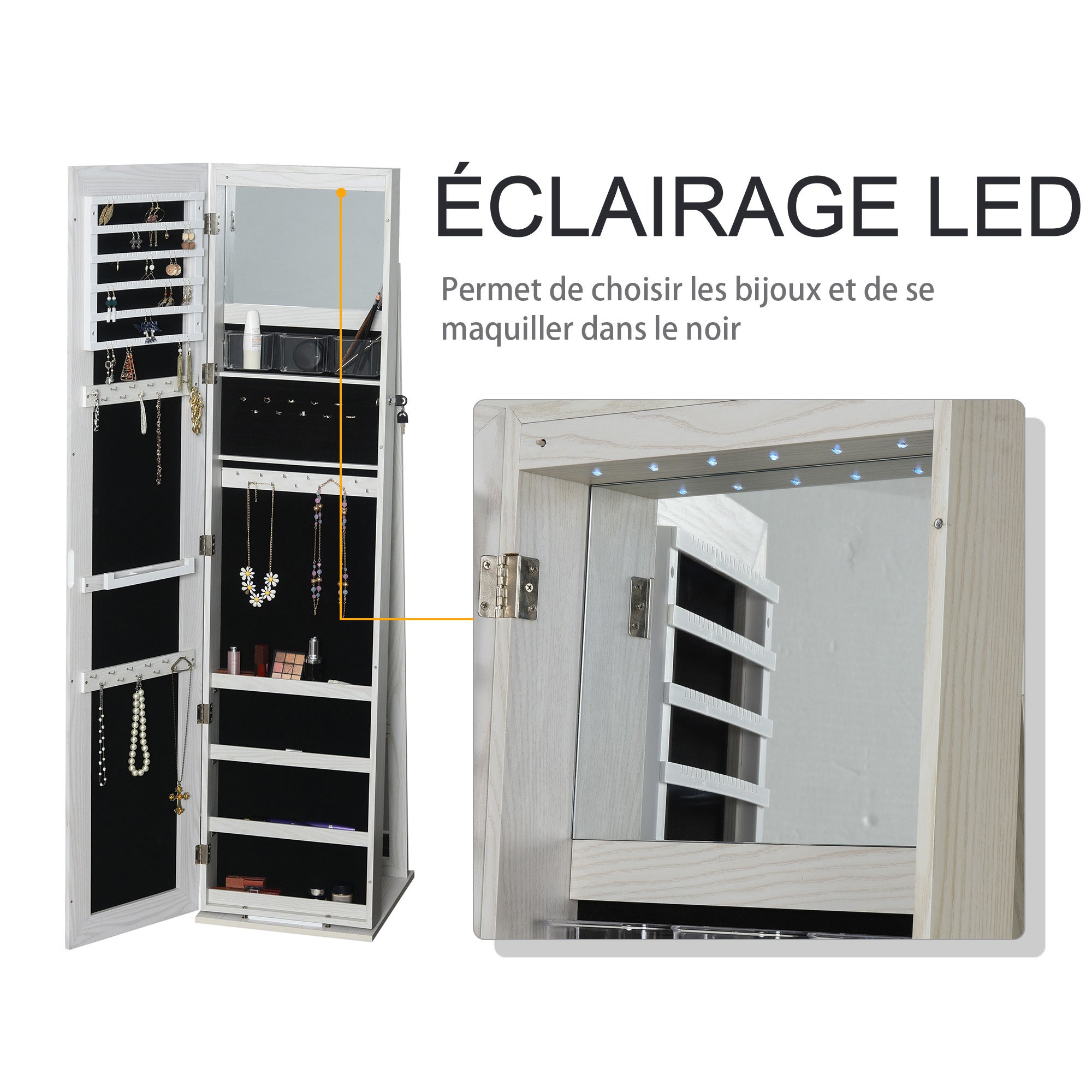 Armoire à Bijoux avec Miroir sur Pied Multi-rangements éclairage LED Blanc dim. 38L x 38l x H157 cm