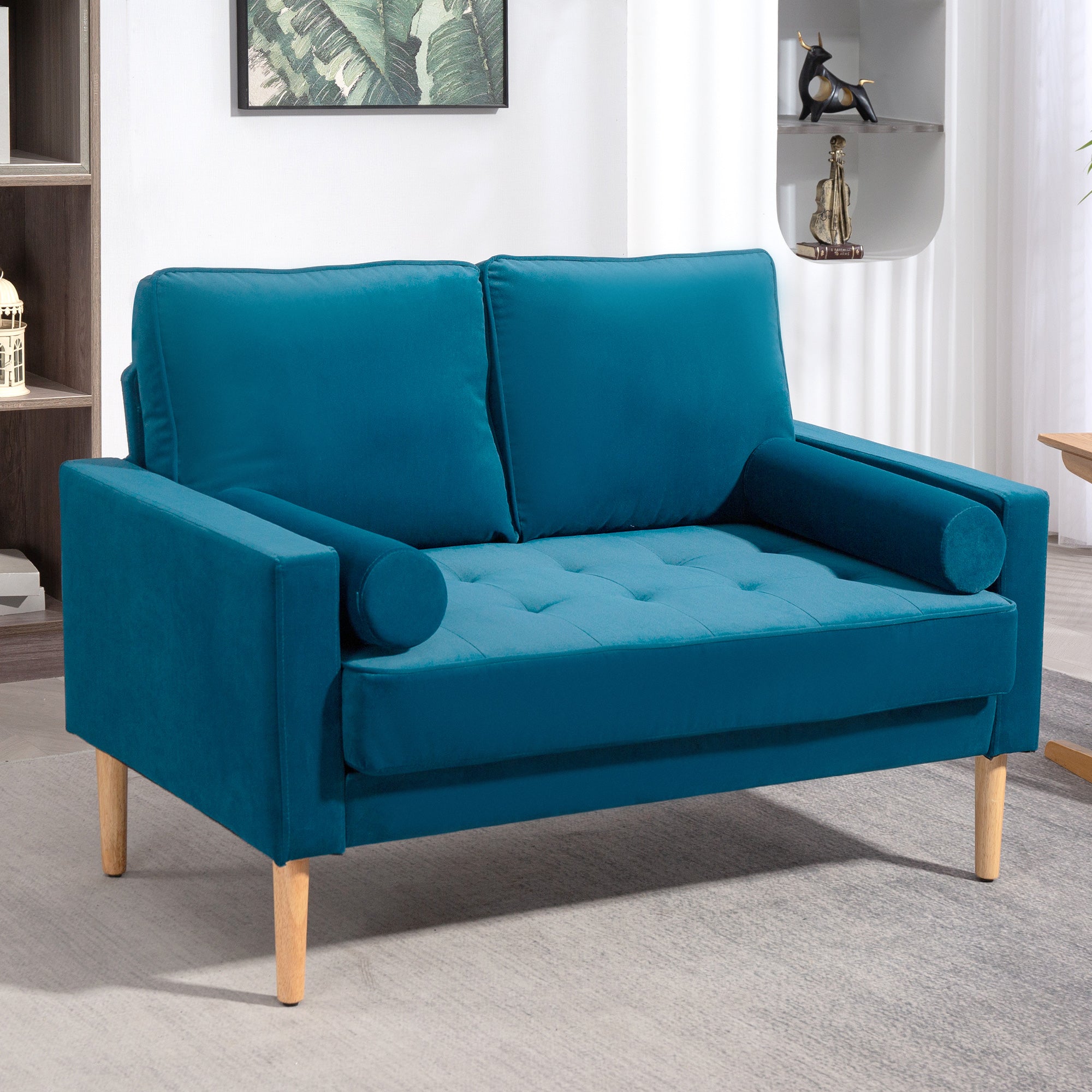 Canapé 2 places canapé moderne en velours 127 cm, coussins à ressorts épais, pieds en bois d'hévéa, 2 oreillers et assise capitonnée, banquette 2 places pour salon, chambre, petit espace, bleu