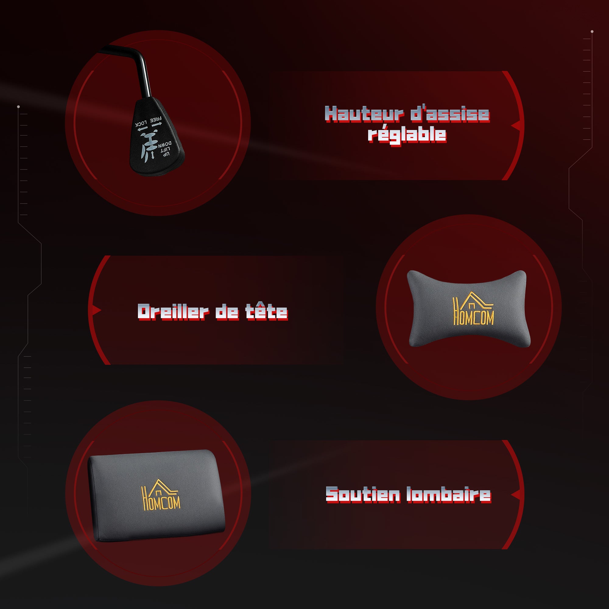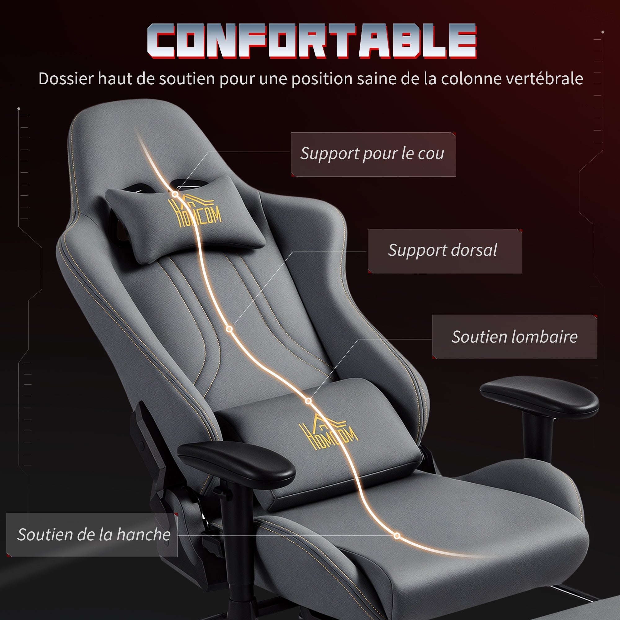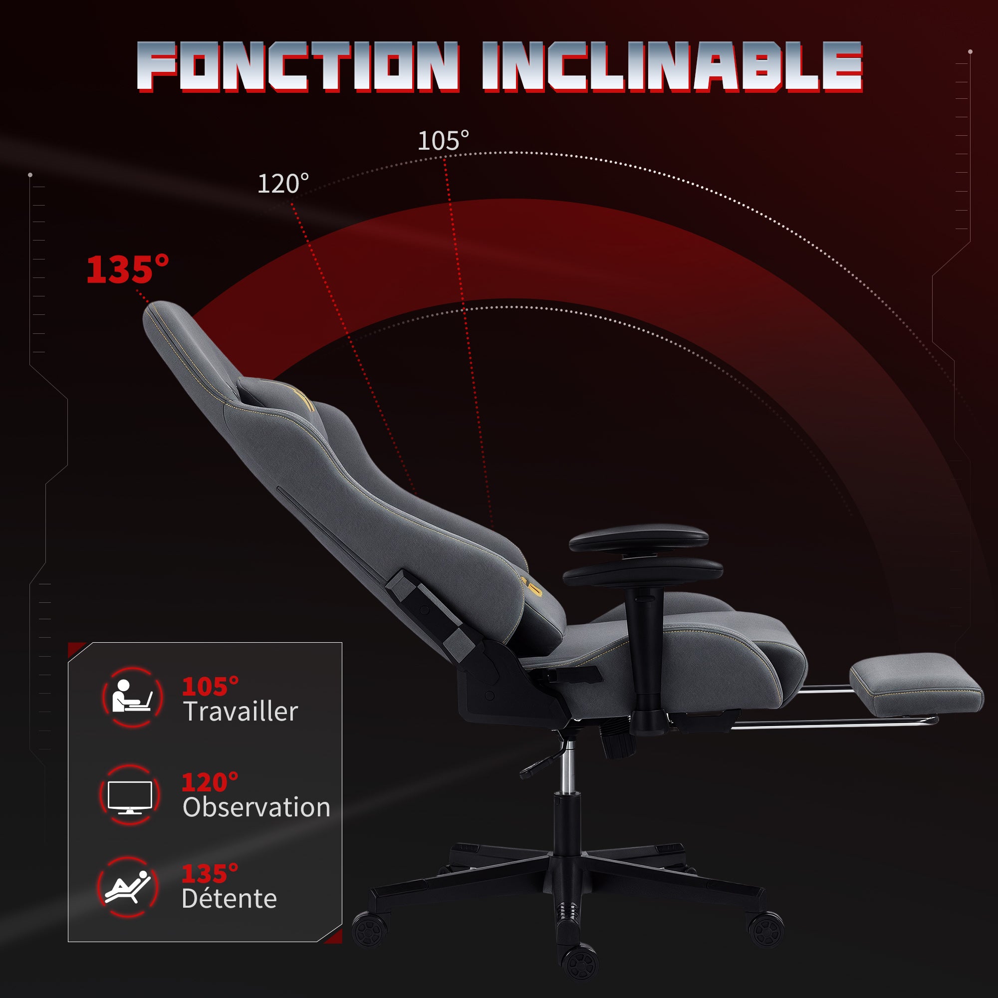 Chaise gaming ergonomique avec accoudoirs réglables, fauteuil gamer en suède avec dossier inclinable, hauteur réglable, repose-pieds, appui-tête, soutien lombaire et pivotant à 360°, gris
