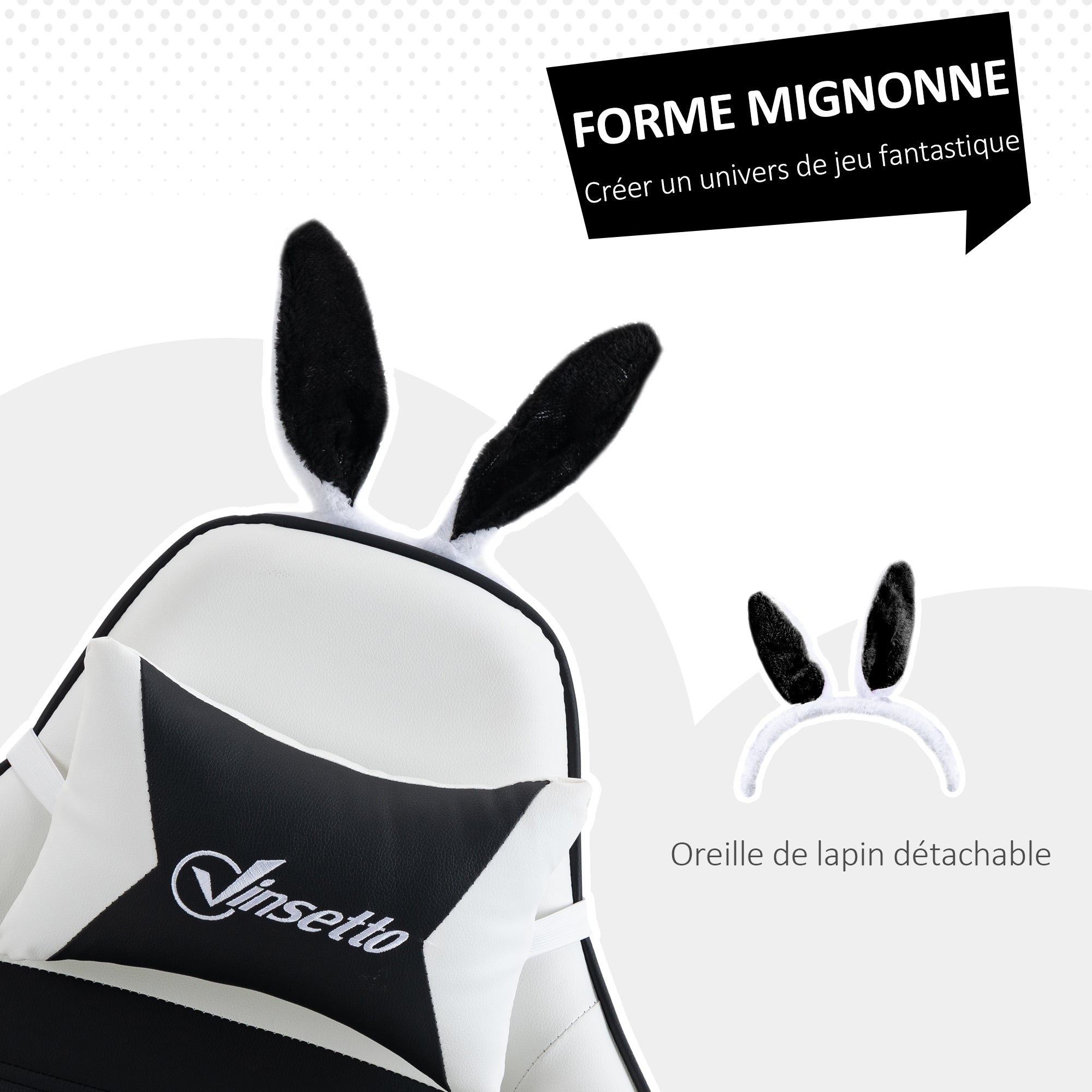 Chaise gaming fauteuil gamer fauteuil de bureau ergonomique avec support lombaire, hauteur réglable, dossier inclinable, repose-pieds, oreilles de lapin et appui-tête, noir