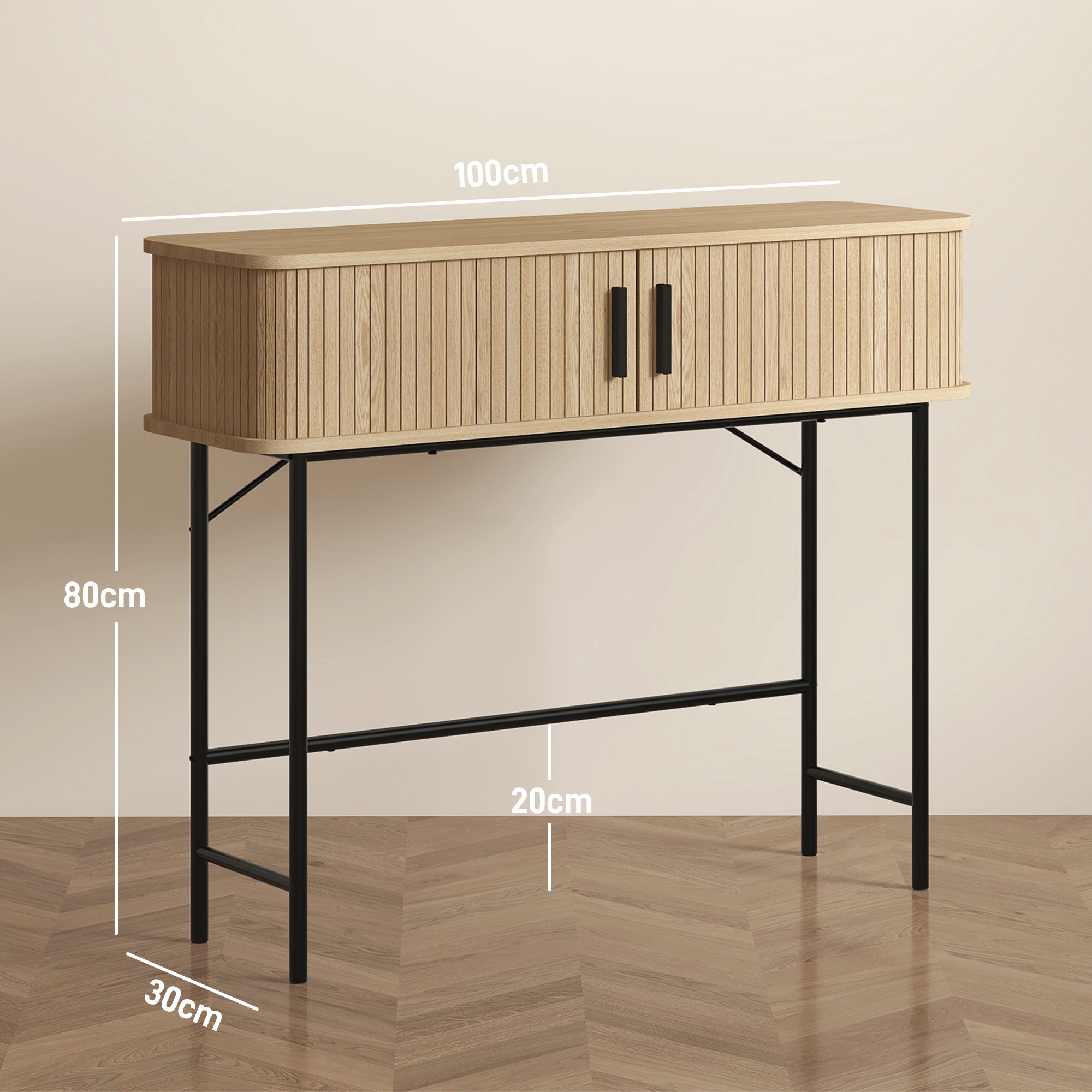 Console meuble, table console, console entrée, table d'entrée avec portes coulissantes à lattes et pieds en acier, bout de canapé pour salon, chêne et noir