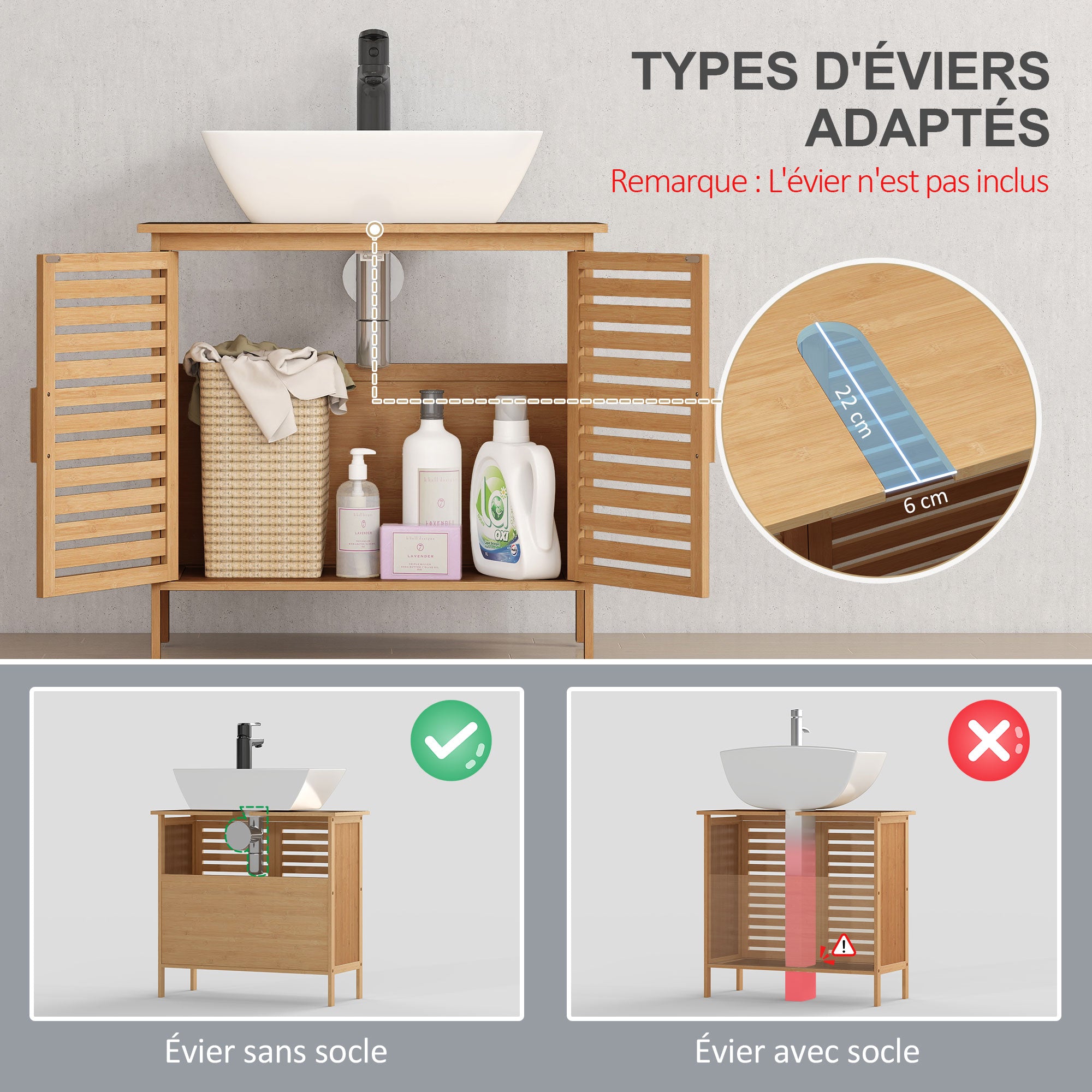 Meuble sous lavabo salle de bain en bambou meuble sous vasque meuble de salle de bain sous lavabo 2 portes - 66 x 29 x 61,5 cm