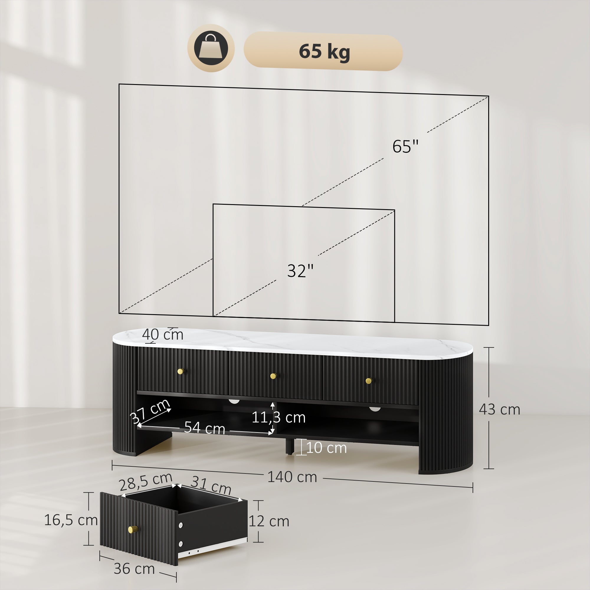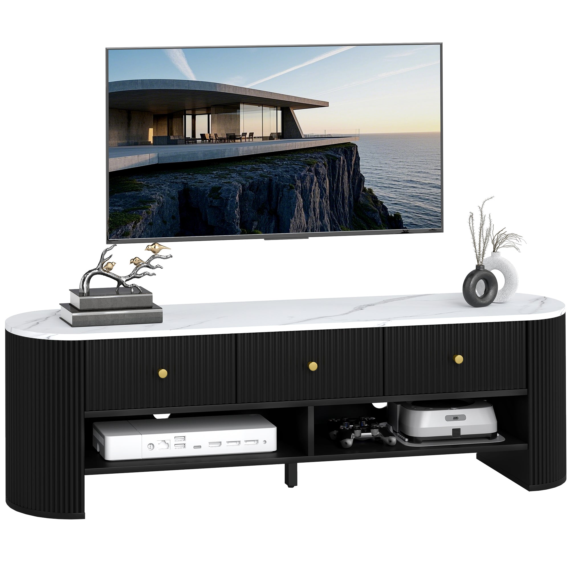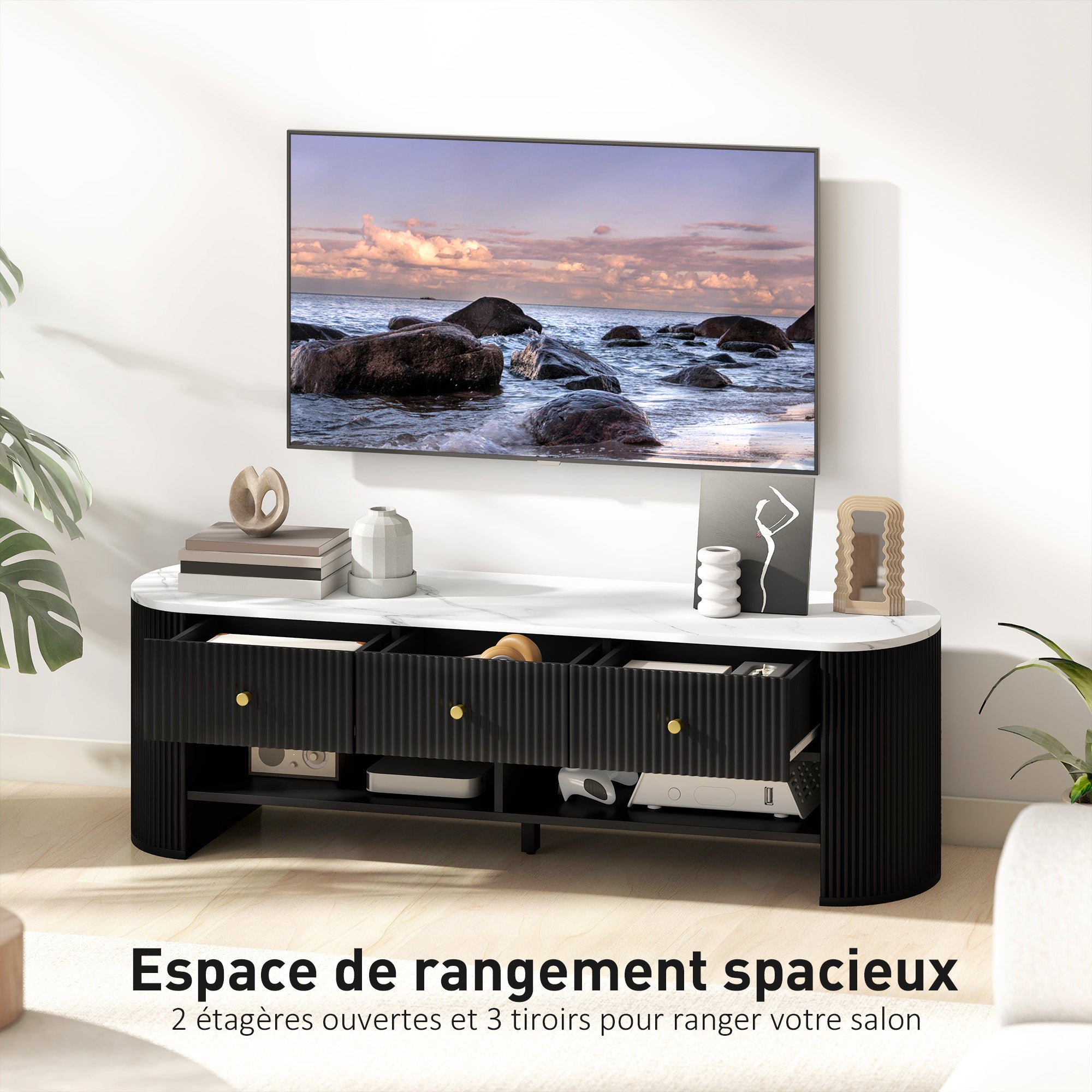 Meuble TV 140 cm, meuble télé pour téléviseur 32-65 pouces effet marbre avec 3 tiroirs façades à cannelures, 2 étagères ouvertes et 2 trous pour câbles, banc TV moderne, noir