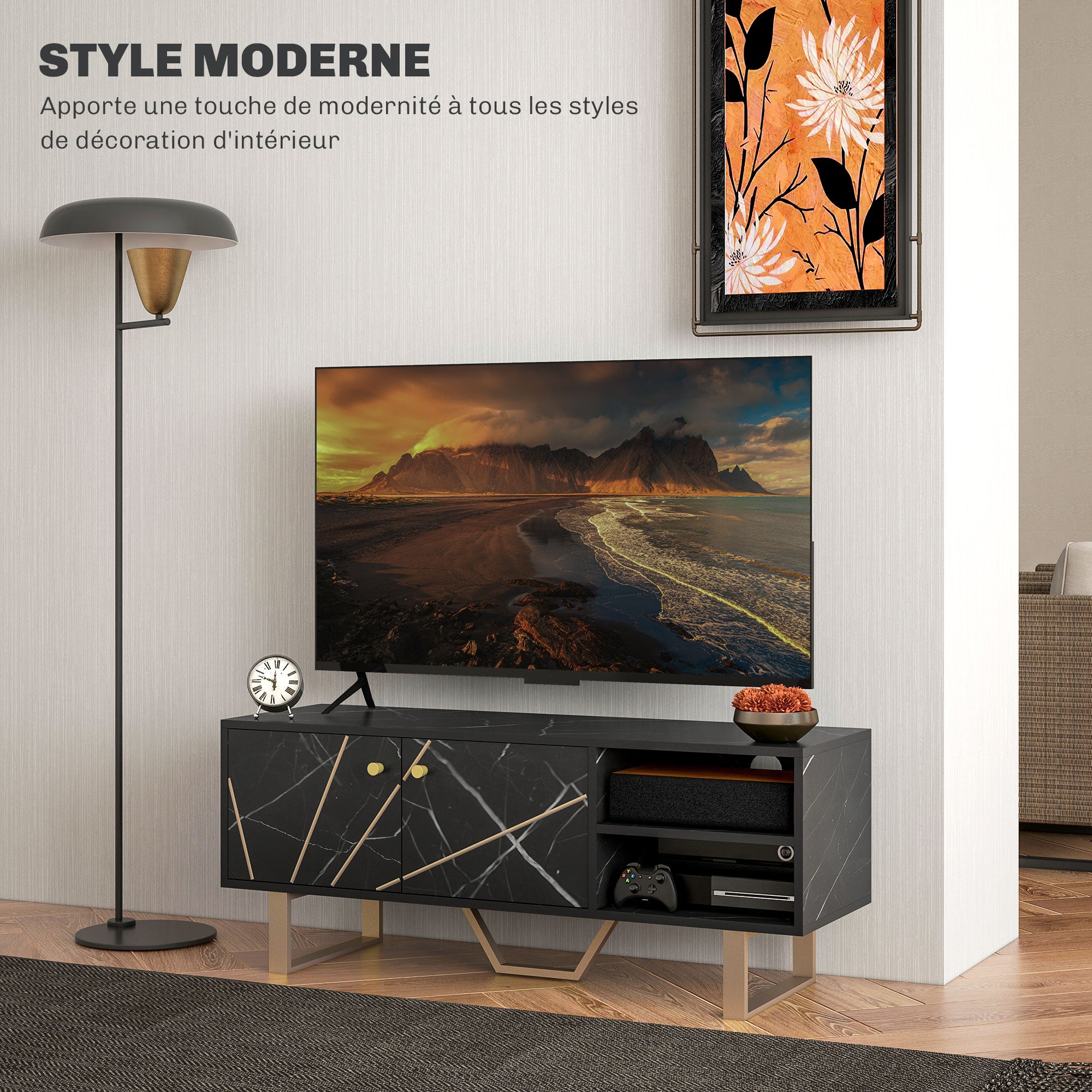 Meuble TV banc TV meuble pour télévision jusqu'à 50 pouces avec placard, étagère réglable et passe-câbles, dim. 110l x 35P x 45H cm aspect marbre noir